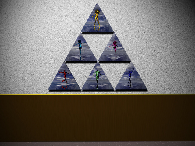 serie di 6 foto di ballerini levitanti sotto un gigante specchio tetraedrico formato triangolo (misura totale: 180 x 150 cm, peso: ca. 5kg con cornice)